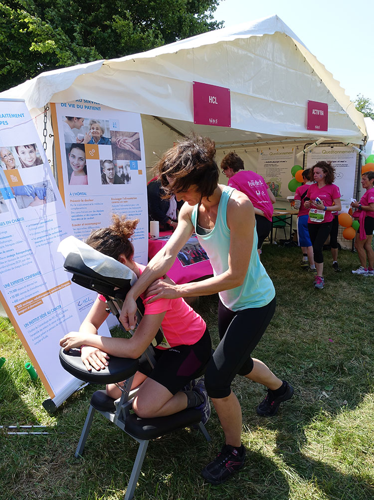Les Hopitaux Civils de Lyon (HCL) m’ont demandé d’intervenir de 11h à 13h, pour faire des massages courts aux visiteurs de leur stand et aux sportives de leur équipe après la course (et ce grâce à ma prestation au Tournoi de Badminton de Brindas, où j’ai rencontré Laure, chargée de com aux HCL, en avril dernier).